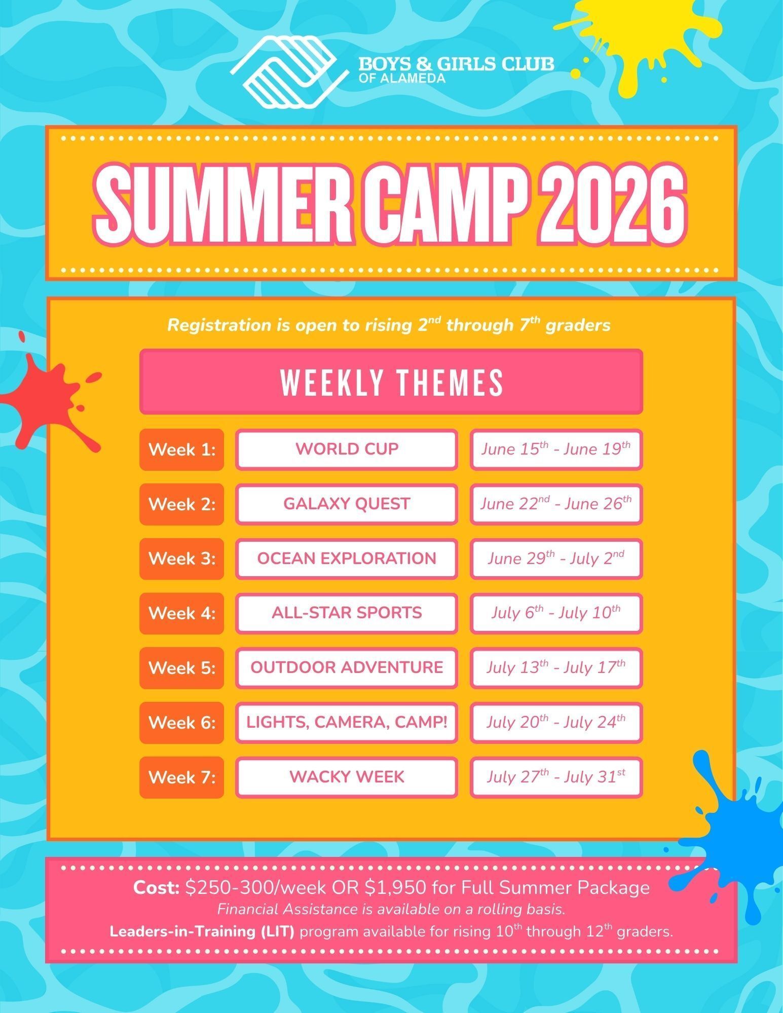 The Alameda Boys & Girls Club is excited to welcome rising 2nd through 7th graders to our 7-week Summer Camp! Weekly themes, daily activities, and field trips will ensure your child has a blast this summer break!